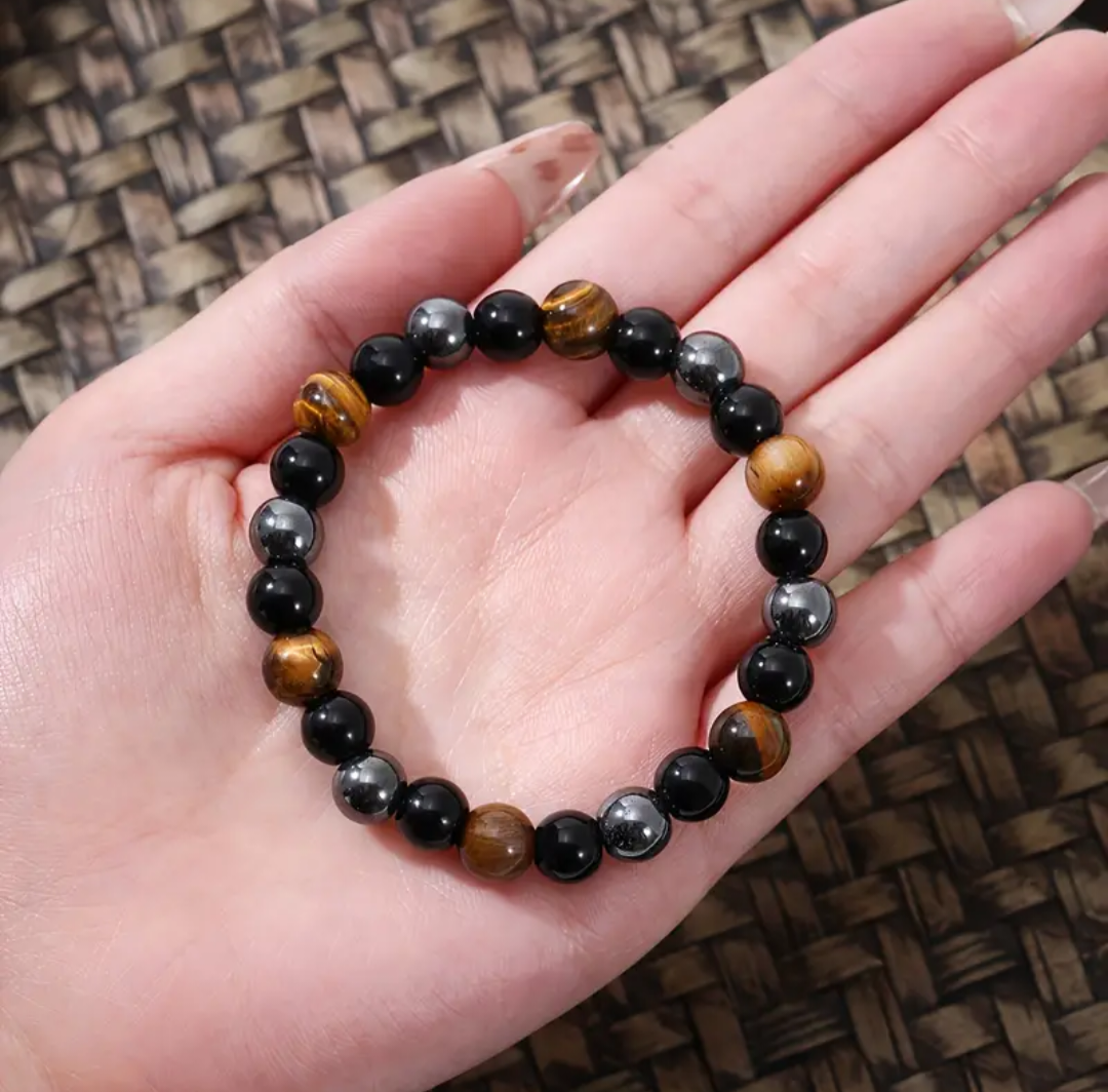 Una combinación poderosa de protección y equilibrio. Esta pulsera está elaborada con esferas de 8 mm en hematites, piedra de anclaje que aporta fortaleza y estabilidad; obsidiana, guardiana natural contra las energías negativas; y ojo de tigre, un clásico amuleto de confianza, seguridad y claridad mental.